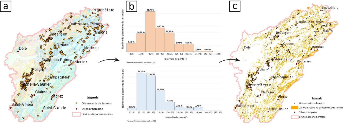 a. Carte géologique vectorisée des départements du Jura et du Doubs. Les événements de glissements de terrains recensés sont représentés en orange. b. Histogramme du pourcentage de glissements de terrain classé selon la lithologie et la pente moyenne des sites. c. Représentation des zones à risques de glissements de terrain (orange) dans les départements du Jura et du Doubs basée sur les critères géomorphologiques des événements recensés.